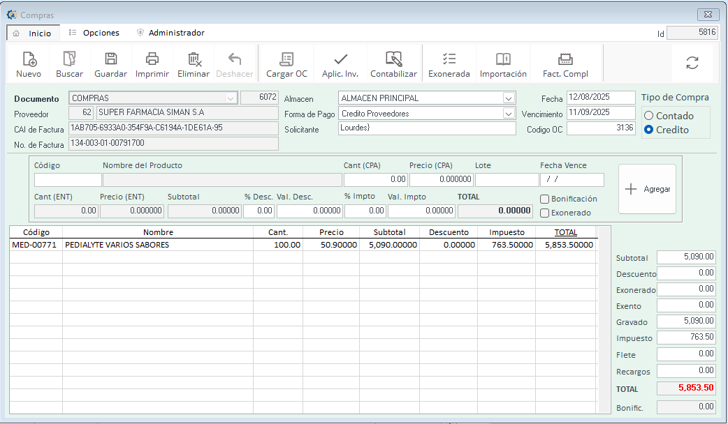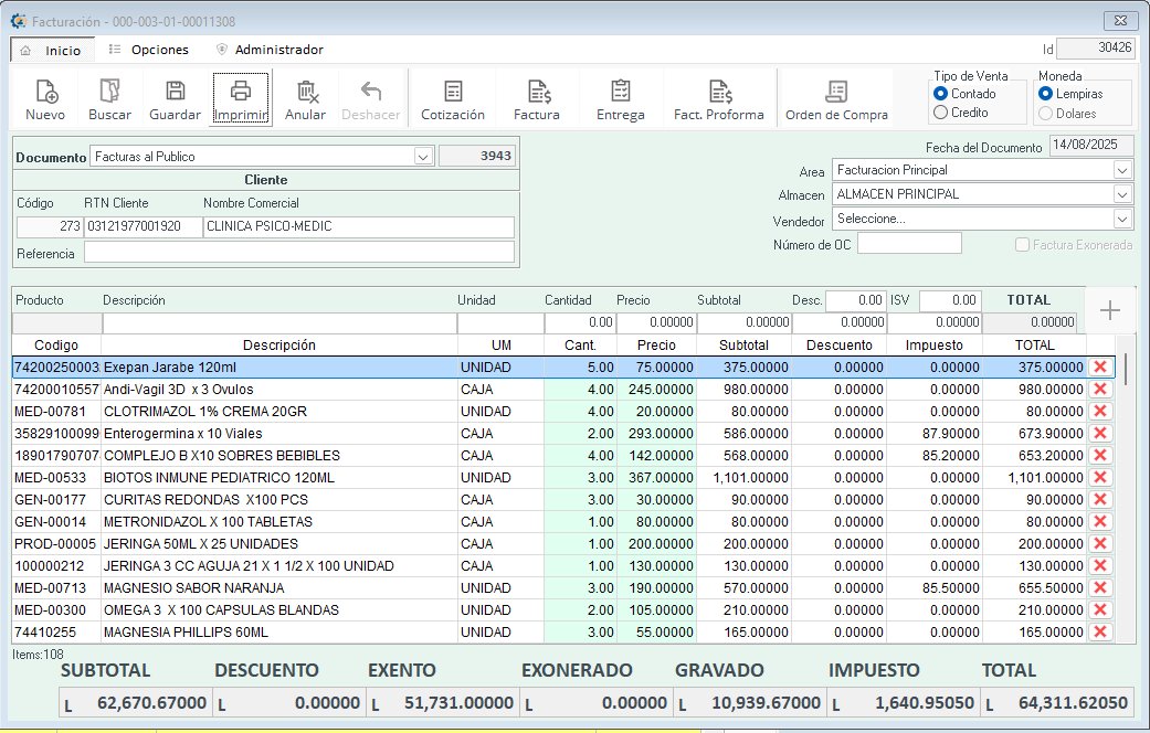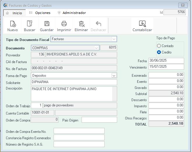 - Catálogos: clientes/proveedores, áreas de facturación, tipos de documento, descuentos.