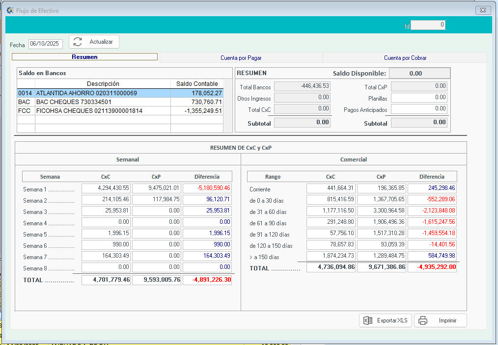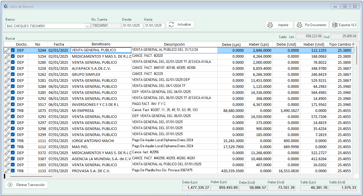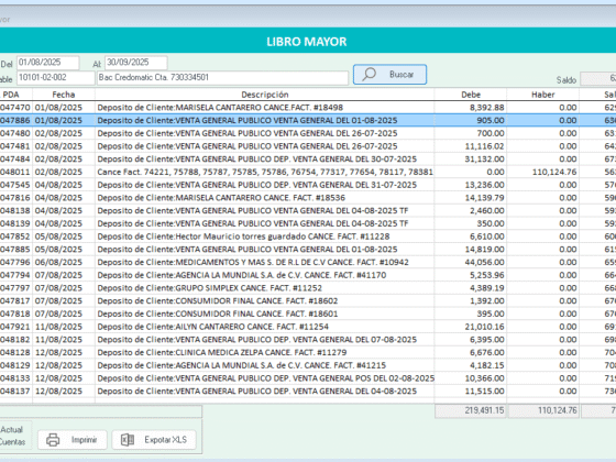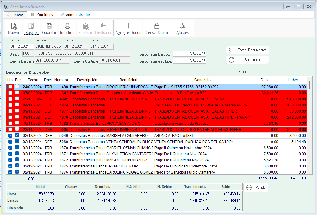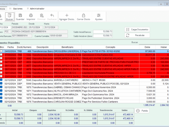 - Operación: cheques, transferencias, depósitos (manuales y vinculados), retiros, pagos masivos, notas bancarias, traslados internos.