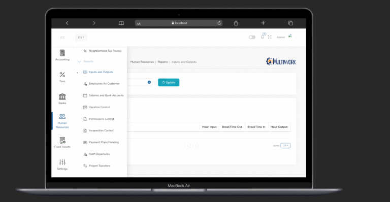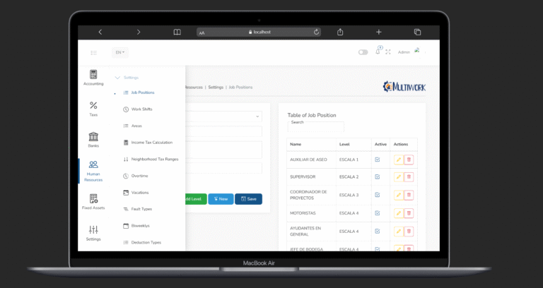 - Configuración: tipos de contrato, estructura de planillas, horarios, tipos de faltas.