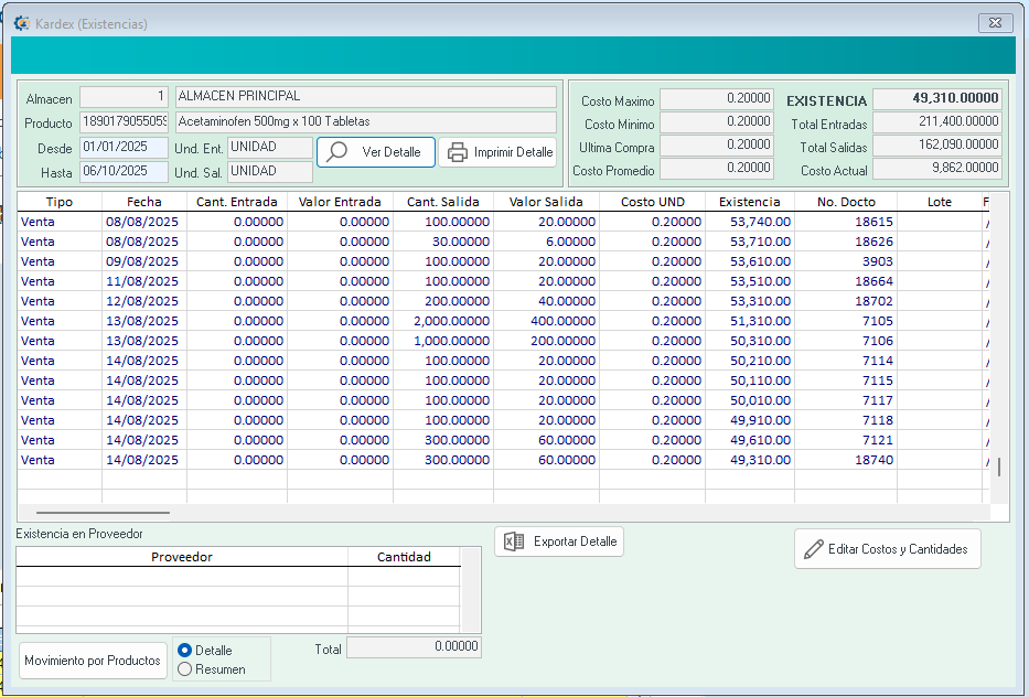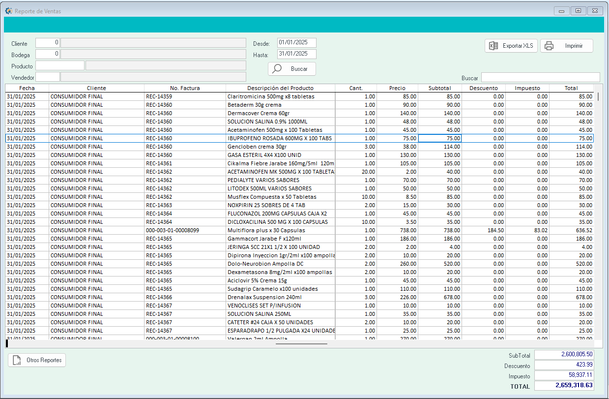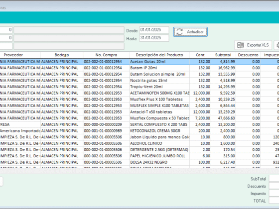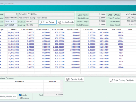 - Movimientos: ingresos, compras, órdenes de compra, traslados, requisiciones, reintegros, ajustes.