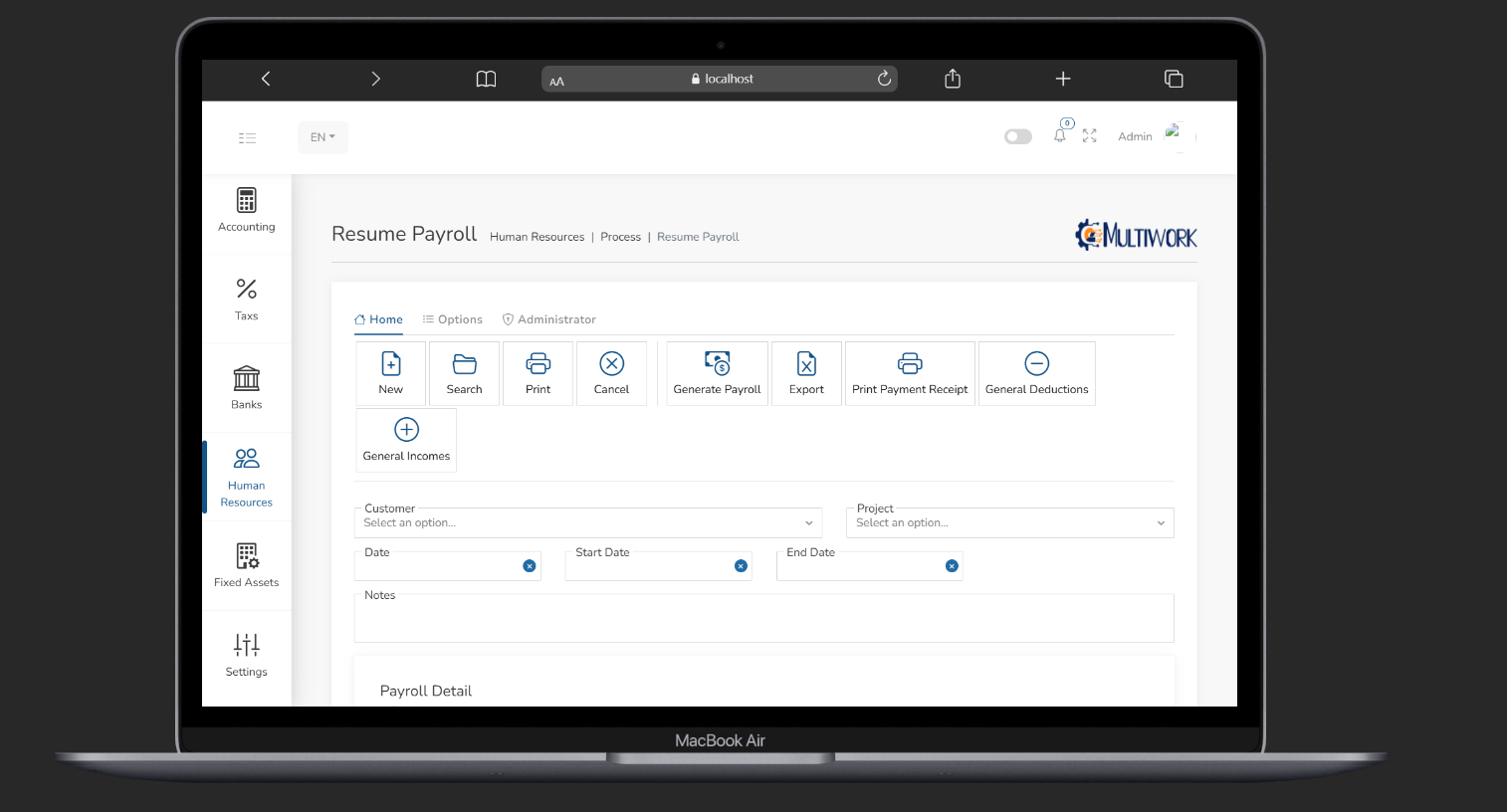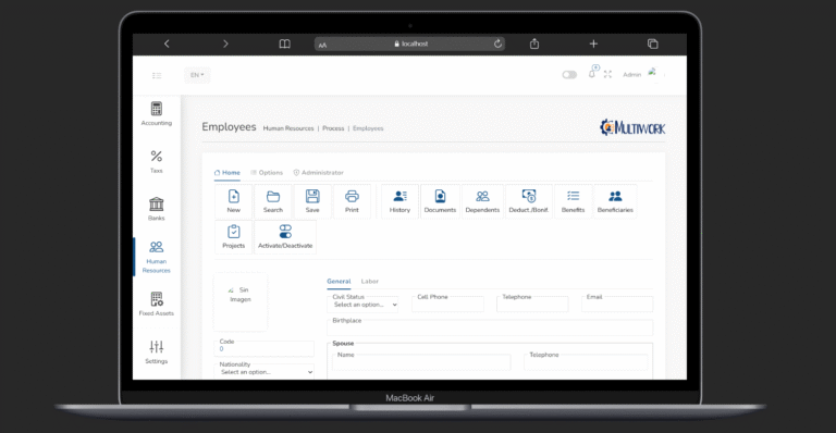 - Nómina: ingresos/deducciones, prestaciones, recibos PDF, planes de pago/préstamos.