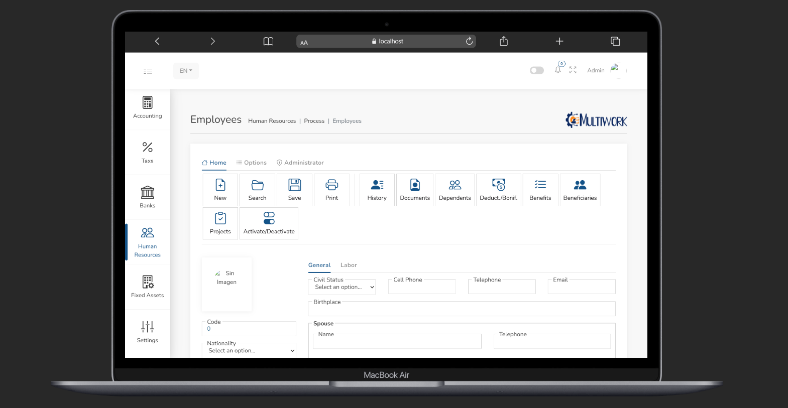 - Reportes: empleados, ausencias/incapacidades, préstamos.